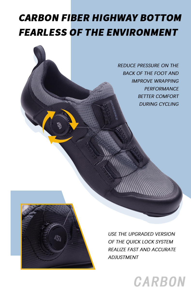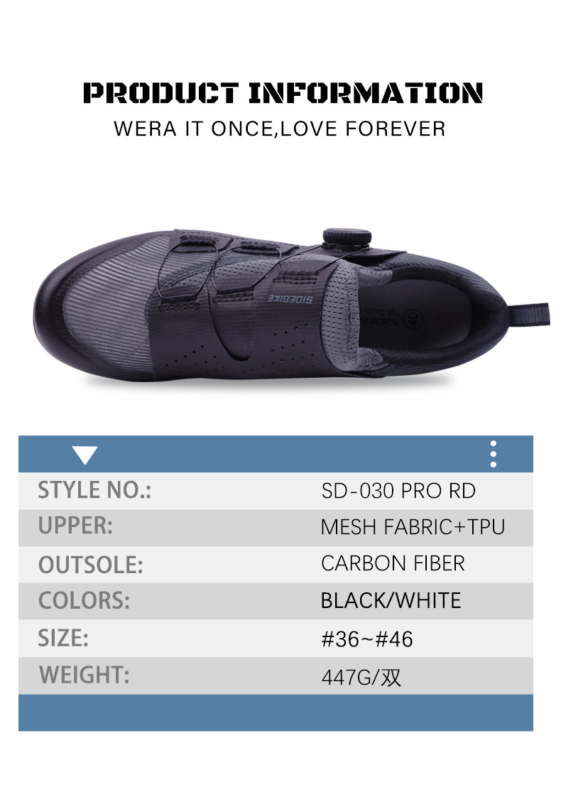 The new SD030 road lock shoe for track riders features a lightweight design with double rotating shoe buckles. The shoe body is made of breathable mesh fabric in all directions, and the sole is made of carbon fiber outsole, ensuring high strength and ligh